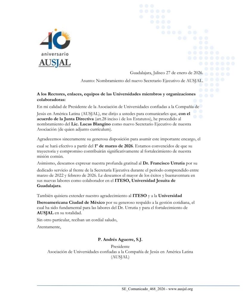 En mi calidad de Presidente de la Asociación de Universidades confiadas a la Compañía de Jesús en América Latina (AUSJAL), me dirijo a ustedes para comunicarles que, con el acuerdo de la Junta Directiva (art.28 inciso i de los Estatutos), he procedido al nombramiento del Lic. Lucas Blangino como nuevo Secretario Ejecutivo de nuestra Asociación (de quien adjunto currículum).